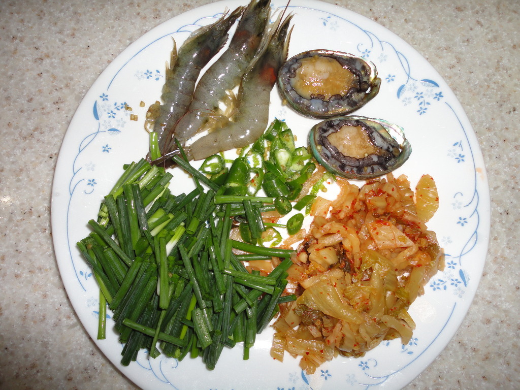 새우, 전복, 묵은지 송송 썰어 참기름에 무쳐놓고 청양고추(요게 들어가야 칼칼한 맛이 난다)와 실파를....