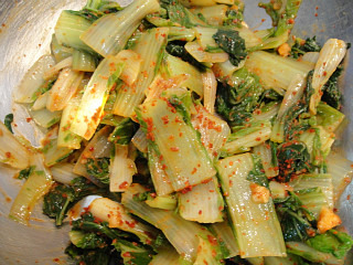 재료: 얼갈이3덩어리(350g). 된장1T반. 고추가루2T. 다진마늘1T. 소금1/3T. 다진파2T