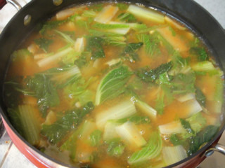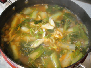 얼갈이를 넣은후 끓어오르면 중불로 줄이고....중간중간 거품제거해주시고....소금간해줍니다..(1/3~1/2T정도)