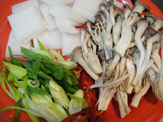 재료: 쇠고기국거리용200g. 무1토막(4cm정도두께). 대파1/2개. 참타리버섯1/2팩. 홍고추1개.
