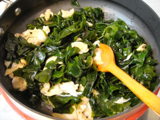 재료: 불린미역3줌(250g). 조개살 한줌(150g). 들기름1T. 다진마늘2/3T. 소금1/2T.
