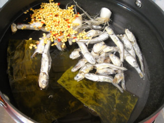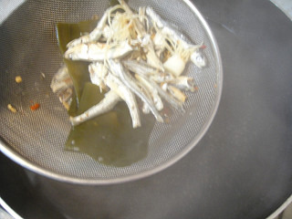 1. 멸치다시마육수 끓이기 : 냄비에 물7컵을 부은후 멸치한줌 + 다시마2조각 + 고추씨1T + 대파뿌리2개를 넣고