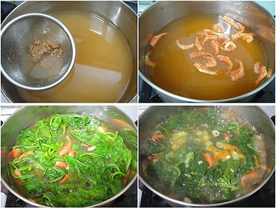 여기에 마른새우 한줌을 넣고 가스불을 센불로 켠후 끓어오르면 1분후 아욱을 넣어줍니다...