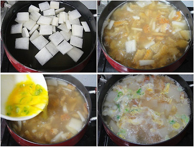 5분이 지난후 달걀푼 물을 부어준후 소금2/3T를 넣어 간을 맞춘후 1~2분만 더 끓이면 완성입니다..