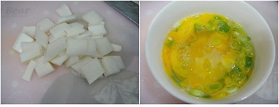 재료: 황태채 60g ( 한줌반정도). 무1토막( 두께 2cm × 지름5cm정도). 달걀2개. 다진파2T.