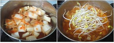 끓어오르면 중불로 줄이고 뚜껑을 덮고 5분정도 끓여줍니다...김치를 5분 끓인후 콩나물을 넣고 뚜껑을 덮어줍니다..