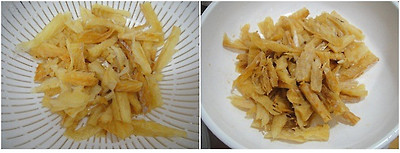 1. 황태채를 먹기 좋게 가위로 잘라준후 소쿠리에 받쳐 흐르는 물에 한번 샤워를 시켜줍니다..