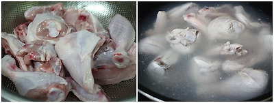 1. 닭은 토막낸 닭을 구입합니다. 잘씻어 준후 끓는물에 20~30초정도만 살짝 데친후 바로 찬물에 헹궈