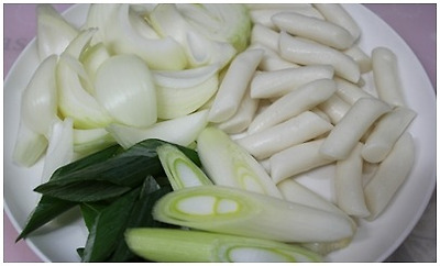 2. 떡볶이 떡은 딱딱한 상태로 준비했습니다. 2줌이고요...찬물에 한번 씻어 준비합니다.