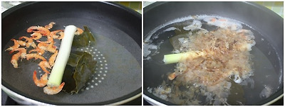 1. 육수만들기 : 냄비에 물10컵. 다시마2조각. 마른새우 한줌. 대파1/2개를 넣고 센불에서 끓으면 중불로