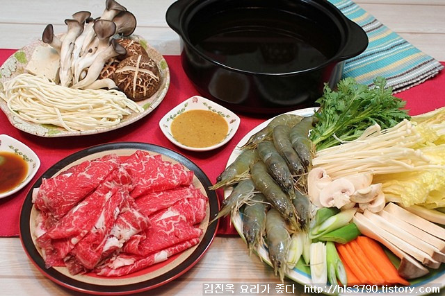 모든 재료가 준비되면 상에 휴대용가스렌지 놓고 육수를 올리고 채소와 버섯 .. 쇠고기와 새우를 끓여가면서