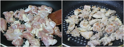 4. 프라이팬을 중약불에서 예열이 되면 밑간한 닭다리살을 넣고 5~6분 노릇하게 구워줍니다.
