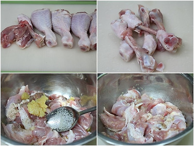 1. 닭다리 뼈에서 살을 분리합니다. 칼로 잘 제거해주세요. 뼈는 잘 세척후 냉동실에 보관후 육수를 끓이시거나