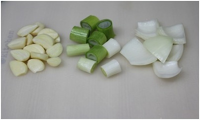 3. 마늘5개는 저며주고요.. 대파1/2개는 굵게 토막내고요.. 양파는 큼직하게 썰어줍니다.