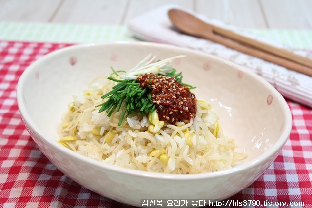 그릇에 콩나물밥 올리고.. 양념장 올리고..달래올리고..비벼드시면 됩니다.