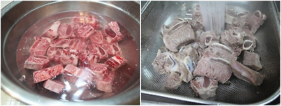 핏물 뺀 소갈비를 끓는물에 넣고 5분정도 살짝 끓인후 바로 찬물에 헹궈줍니다.