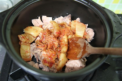 뚝배기에 참치와 익은배추김치2장을 넣어줍니다.