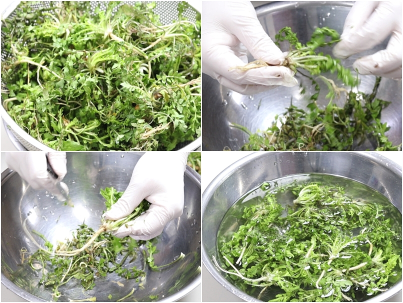 손질한 냉이를 물에 20분정도 담궈준후 흙이 나오지 않을때까지 여러번 세척후 체에 받쳐줍니다.