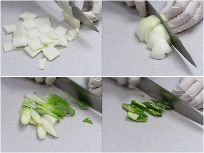 양파1/2개 토막내어주시고요~ 대파반개 어슷썰고 청양고추2개 어슷썰어줍니다.