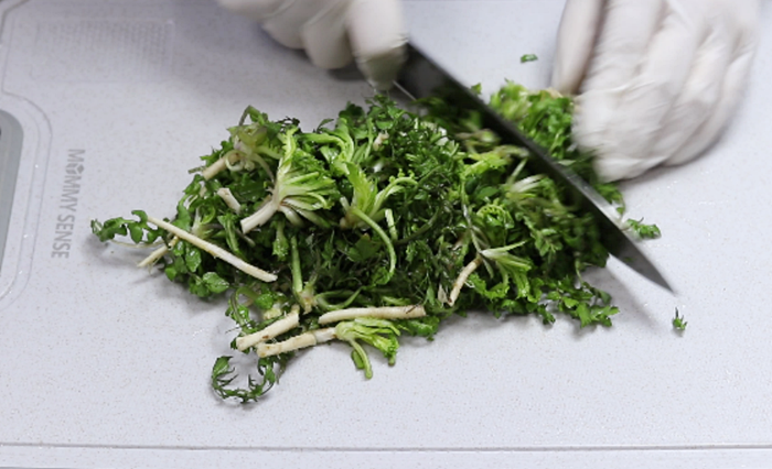 2. 손질한 냉이를 먹기 좋게 썰어줍니다.