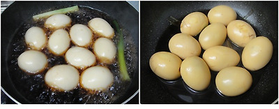 2. 껍질을 제거후 냄비에 넣어 물2컵반 + 간장1/2컵 + 맛술3T + 올리고당2T + 대파1/2개+ 후추가루소량을 넣고