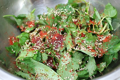 양념을 넣는데요... 참나물의 숨이 죽지 않게 위에 골고루 뿌리듯 양념을 넣어주세요..