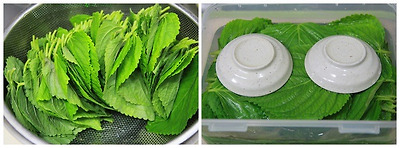 반찬통에 깻잎을 차곡차곡 담은후...