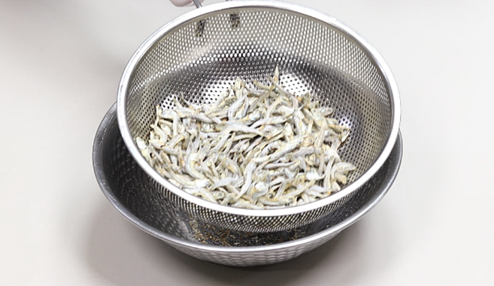 3. 볶은 멸치를 체에 받쳐 멸칫가루를 제거합니다.