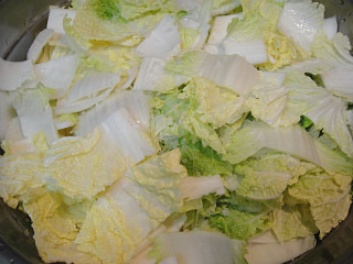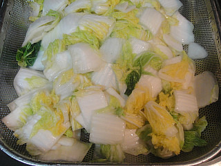 썰은 배추를 찬물에 한두번 씻은후 소쿠리에 받쳐 줍니다...배추에 물기가 약간 묻은 상태로