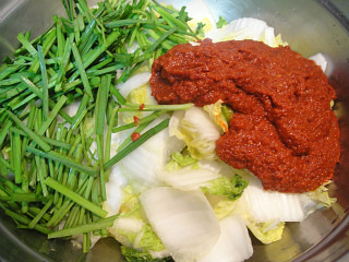 6. 큰 그릇(대야)에 씻어서 물기를 뺀 배추를 넣고 부추를 넣고 양념장을 넣은후 골고루 버무리면 완성입니다..