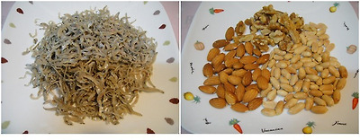 1. 잔멸치2컵과 아몬드.호두.땅콩등 견과류를 준비합니다... 견과류는 먹기 좋게 쪼개주세요....
