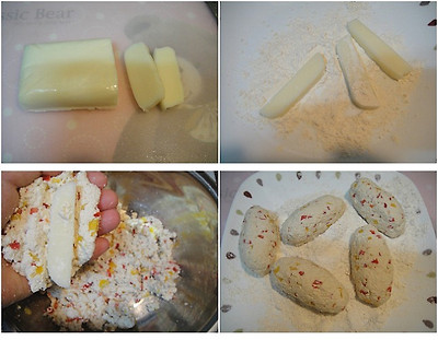 3. 덩어리 피자치즈를 6cm× 0.7cm정도로 썰어줍니다... 피자치즈에 밀가루를 살짝 묻혀줍니다...