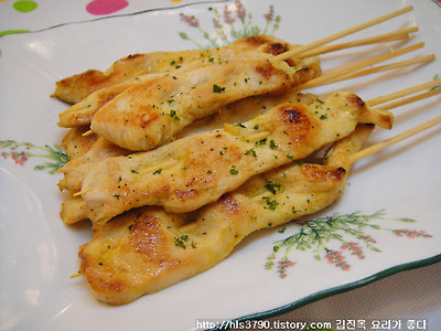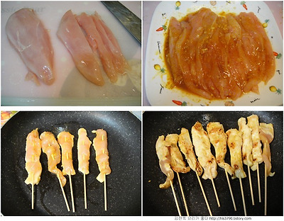 2. 재운 닭가슴살을 꼬치에 길게 꽂아 프라이팬에 소량의 식용유를 두루고 중약불에서 노릇하게 앞뒤면