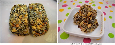 주먹밥처럼 한입크기로 동글랗게 만드셔도 좋습니다...저는 사각그릇에 넣어 사각모양으로 만들었습니다..