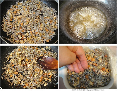 재료: 잔멸치2컵. 아몬드.땅콩.호두 등 좋아하는 견과류1컵. 검은깨와 일반깨1T정도.