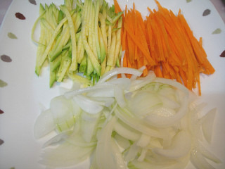 2. 애호박1/3개는 곱게 채썰어줍니다...양파1/2개. 당근1/4개도 곱게 채썰어줍니다...