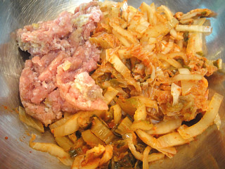 재료 : 익은김치1/4포기. 다진돼지고기( 한줌). 다진마늘1/3T.소금. 후추가루. 참기름.