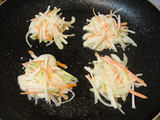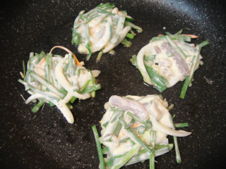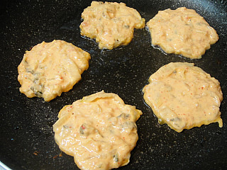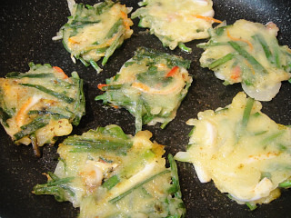 프라이팬에 식용유를 두르고 중불로 한후 팬이 달아오르면 먹기 좋게 반죽을 떠서 노릇하게 한쪽면이