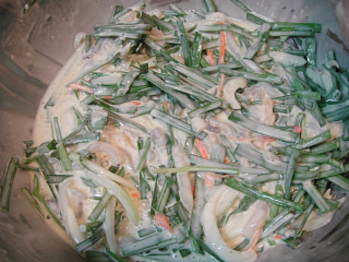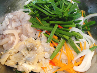 2. 볼에 준비한 오징어.조개살.부추.양파.당근을 넣은후... 부침가루1컵반 . 튀김가루1컵 . 물2컵+1/3컵을 넣은후