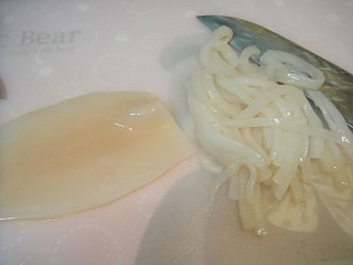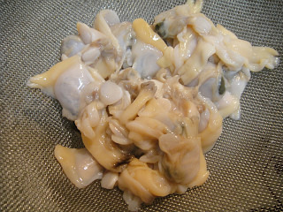 조개살은 씻어 소쿠리에 받쳐 준비합니다... 오징어 1마리는 껍질을 제거후 잘게 썰어 준비합니다..