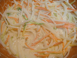 ** 부침개를 바삭하게 반죽하기 위해서 부침가루와 튀김가루를 3:2정도의 비율로 섞어서 반죽하시고요...