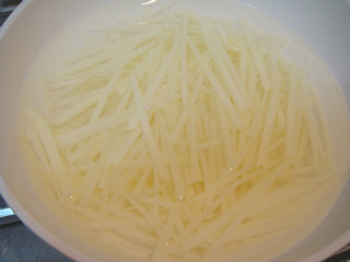 1. 감자1개는 깍아서 곱게 채썰어 찬물에 10분정도 담갔다가 소쿠리에 받쳐 물기를 빼줍니다. (녹말기제거)
