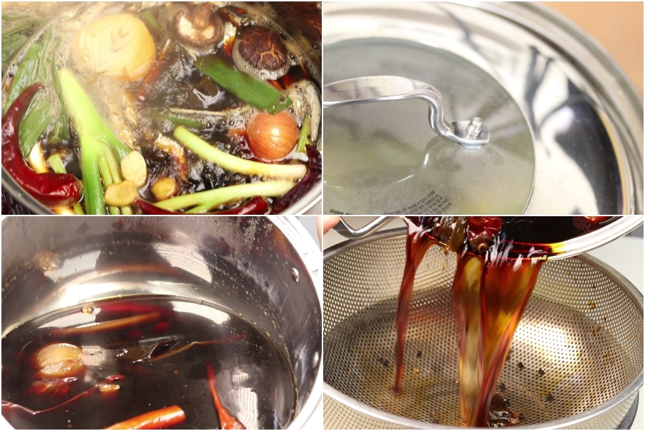 4. 30분 끓인 맛간장을 식혀서 소쿠리에 건져 병에 담아
