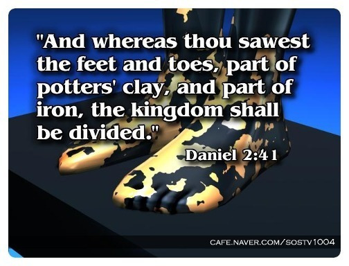 | 다니엘서 2장 - 제 3부 로마 - 철 나라 “넷째 나라는 강하기가 철 같으리니 철은 모든 물건을 부숴뜨리고 이기는 것이라 철이 모든 것을 부수는 것 같이 그 나라가 뭇 나라를 부숴뜨리고 빻을 것이며.” 단 2:40 네 번째 나라는 가장 주목할 만한 나라인데, 그 나라는 그리스를 뒤엎은 나라이다. 어느 나라가 예수 그리스도께서 이 땅에 사실 당시에 세계를 지배하고 있었는가? 바로 로마제국이다. 그러므로 네 번째 제국은 로마이다. B.C 168 ~ A.D 351년 동안 세상을 지배했다. 신상의 두 다리는 철로 만들어져 있었는데, 이것은 로마제국이 나중에는 동로마와 서로마로 나뉘어지는 것을 상징한다. 거의 500년 동안의 긴 기간 동안 로마는 두 개의 제국으로 분리되어 존재하였다. 로마는 철처럼 짓밟고 물어뜯는 아주 강력한 군대를 가진 나라였다. 로마제국의 명령으로 예수의 부모인 요셉과 미리아가 호적하러 베들레헴으로 가게 되었고, 예수 그리스도께서도 로마 군인들의 철 못에 의하여 십자가에 못 박혀 돌아가셨다. 이렇게 성경은 이 놀라운 사실을 간단하면서도 자세하게 예언으로 기록하고 있는 것이다. 역사가 에드워드 기본(Edward Gibbon)씨는 자신의 책“로마제국의 쇠퇴와 멸망”에서 다음과 같이 기록했다. "로마제국은 세상을 가득 채웠고 그 제국은 단 한 사람의 손 안에서 움직여졌다. 시이저를 대항하는 것은 불가능한 일이었다. 도망하는 일도 불가능하였다. 로마제국의 군대는 무적이었으며 항상 전쟁에서 승리하였고 유프라테스 강과 다뉴브, 라인 강들을 따라 차례대로 신속히 정복해 나아갔다. 금과 은과 동과 철의 상징들은 철의 제국에 의하여 무참히 부수어진 나라들과 왕들을 상징하기에 아주 적합하다." 이 역사가도 다니엘서 2장의 예언을 인용하여 역사를 흥미있게 기록한 사실을 볼 수 있다. 철로 상징된 로마는 강력한 군대를 가진 제국으로서 많은 나라들을 잔인하게 부수고 짓밟는 일을 자행한 사실을 역사 속에서 확인할 수 있다. 지금까지 세상 역사의 반복되는 패턴을 지켜 보면서, 한 나라가 일어나면 또 다른 나라가 그 뒤를 이어 일어나 세상을 지배하고 또 다시 다른 나라가 일어나서 이전 나라를 패망케 하면 곧 다시 다른 나라가 뒤를 이어 일어나는 네 번에 걸친 흥망성쇠의 연속을 바라 볼 때에, 우리는 그 뒤에 다섯 번째의 나라가 일어나게 될 것으로 추측하게 된다. 그러나 놀랍게도 성경은 그렇게 예언하지 않았다. 그 놀라운 예언의 국면을 살펴 보도록 하자. 별들과 항성들을 만드시고 운행하시는 하나님께서 세상의 역사도 지배하고 계신다는 사실을 확신케 해 주는 대목이다. 열국 시대 - 철과 진흙 나라 “왕께서 그 발과 발가락이 얼마는 토기장이의 진흙이요 얼마는 철인 것을 보셨은즉 그 나라가 나누일 것이며 왕께서 철과 진흙이 섞인 것을 보셨은즉 그 나라가 철의 든든함이 있을 것이나 그 발가락이 얼마는 철이요 얼마는 진흙인즉 그 나라가 얼마는 든든하고 얼마는 부숴질 만할 것이며 왕께서 철과 진흙이 섞인 것을 보셨은즉 그들이 다른 인종과 서로 섞일 것이나 피차에 합하지 아니함이 철과 진흙이 합하지 않음과 같으리이다.” 단 2:41-43 이 예언에 의하면 다섯 번째 제국은 없다. 네 번째 제국이 열 왕국으로 갈라진다. 철과 진흙이 섞인 것처럼 강하고 약한 나라가 섞이는 열국 시대가 도래한다. 오래 전부터 성경은 세상 역사를 정확하게 우리에게 이미 설명해 주었다. A.D 331년 이후부터 지금까지 로마제국은 분열되어 있는 채로 지금까지 존재하고 있다. 하나님께서 더 이상 합치지 못할 것이라고 하셨다. 주님의 예언은 한 번도 어겨진 바가 없다. 로마 나라가 나중에는 좀더 숫자가 많아지거나 적어진 적은 있지만 처음에는 정확하게 열 나라로 분열되었다는 사실을 역사가 증명하고 있다. 신상의 발과 발가락에 철과 진흙이 섞여 있는 것으로서 상징된 것은, 어떤 나라는 강하고 어떤 나라는 약한 나라들일 것이지만 이 세상은 열국으로 나뉘어져서 공존하게 될 것이라는 사실을 상징한다. 4세기 중반부터 5세기 중반까지 북쪽에 살던 앵글로 색슨, 프랑크, 알레마니, 벌건디안, 반달, 훈, 수에비와 같은 민족들이 약해져 있는 로마제국을 침략해 내려 오면서 제국의 토지들을 각기 제 나름대로 점령해 나가기 시작하였다. 프랑크족은 지금의 불란서를 이루게 되었고 앵글로 색슨은 영국에 머물게 되었으며 수에비족은 지금의 스위스를 점령하는 등 지금 우리가 알고 있는 현재 유럽을 이루게 되었다. 성경 예언의 정확성을 다시 한 번 살펴 보자. 바벨론, 메대 페르샤, 그리스, 로마가 순서대로 일어나더니, 인간의 생각대로 다섯 번째 나라가 일어나는 것이 아니라, 다니엘 선지자가 기록한 대로 여러 나라로 갈라진 열국 시대가 되더니 어떤 나라는 철의 금속처럼 강한 나라가 되고 어떤 나라는 진흙처럼 약한 나라로 남아있게 되었다. 그런데 이 유럽이 다시 연합하게 될까? 아니면 다시 세계를 제패하는 다른 한 세력이 등장하게 되는 것일까? 다니엘 2장 43절에서 읽은 바와 같이 그들은 피차에 합하지 못할 것이다. 로마제국의 멸망 이후로 여러 사람들이 유럽을 통합