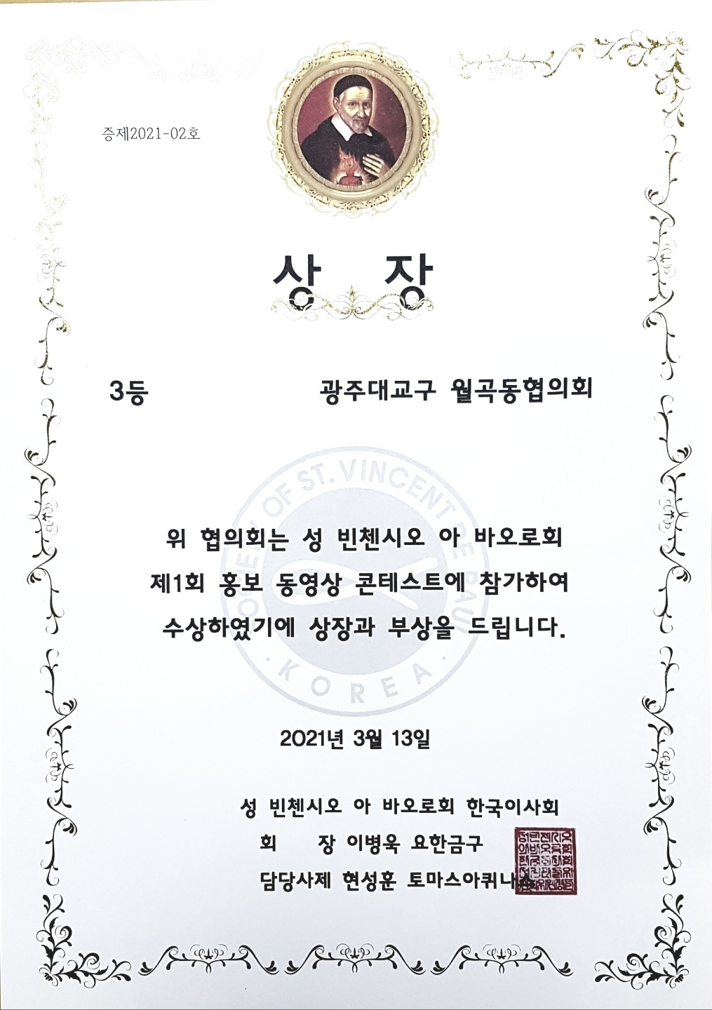 빈첸시오 홍보동영상 콘테스트 월곡동협의회 수상 작성자홍조영 베드로|작성시간21.04.08|조회수122 목록 댓글 0 글자크기 작게가 글자크기 크게가 한국이사회의 주최로 빈첸시오 홍보동영상 콘테스트에서 저희 광산지구 월곡동협의회에서 3등을 수상하셨습니다 다음검색 현재 게시글 추가 기능 열기 북마크 공유하기 신고 센터로 신고 댓글 댓글 0 댓글쓰기 답글쓰기 댓글 리스트