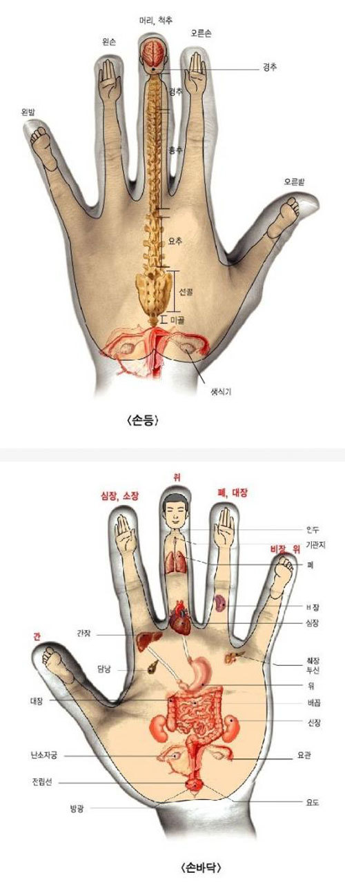 각 부위에 해당하는 모든 요소들이 손등과 손바닥에 연결