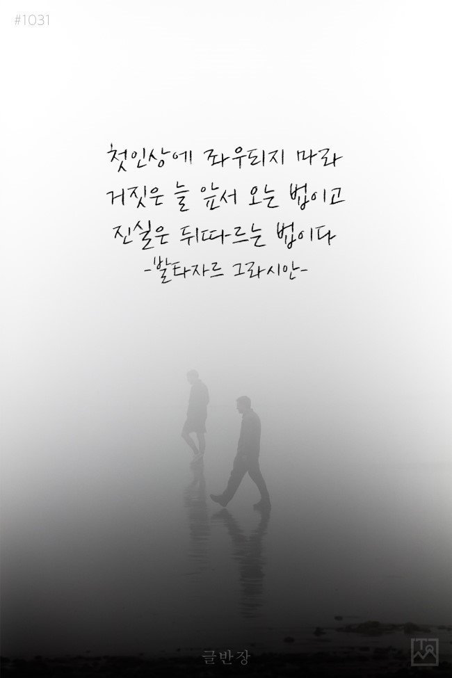 첫인상 작성자free-rein|작성시간18.12.18|조회수480 목록 댓글 1 글자크기 작게가 글자크기 크게가 첫인상에 좌우되지 마라거짓은 늘 앞서 오는 법이고진실은 뒤따르는 법이다-발타자르 그라시안- 다음검색 현재 게시글 추가 기능 열기 북마크 공유하기 신고 센터로 신고 댓글 댓글 1 댓글쓰기 답글쓰기 댓글 리스트 작성자Astroboy | 작성시간 18.12.18 오랜만에 읽네요. 그라시안의 글을... 댓글 전체보기