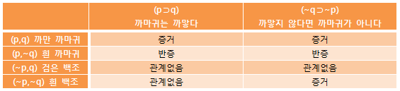 그렇다면 이제 논리학적으로 “모든 까마귀는 까맣다”의 역설을 찾아보자. 까마귀는 까맣다를 논리학적인 형식에 맞춰 변형하면 “p는q이다(p⊃q)”라는 문장이 된다(p는 까마귀, q는 까맣다). 그리고 형식논리학에서 “까맣지 않다면 까마귀가 아니다”라는 대우조건의 문장을 도출해보자. “~q는~p이다(~q⊃~p)”이는 처음의 문장 p⊃q와 정확히 동일한 값을 지닌다. ~q⊃~p가 참이면 p⊃q도 참이어야 한다.