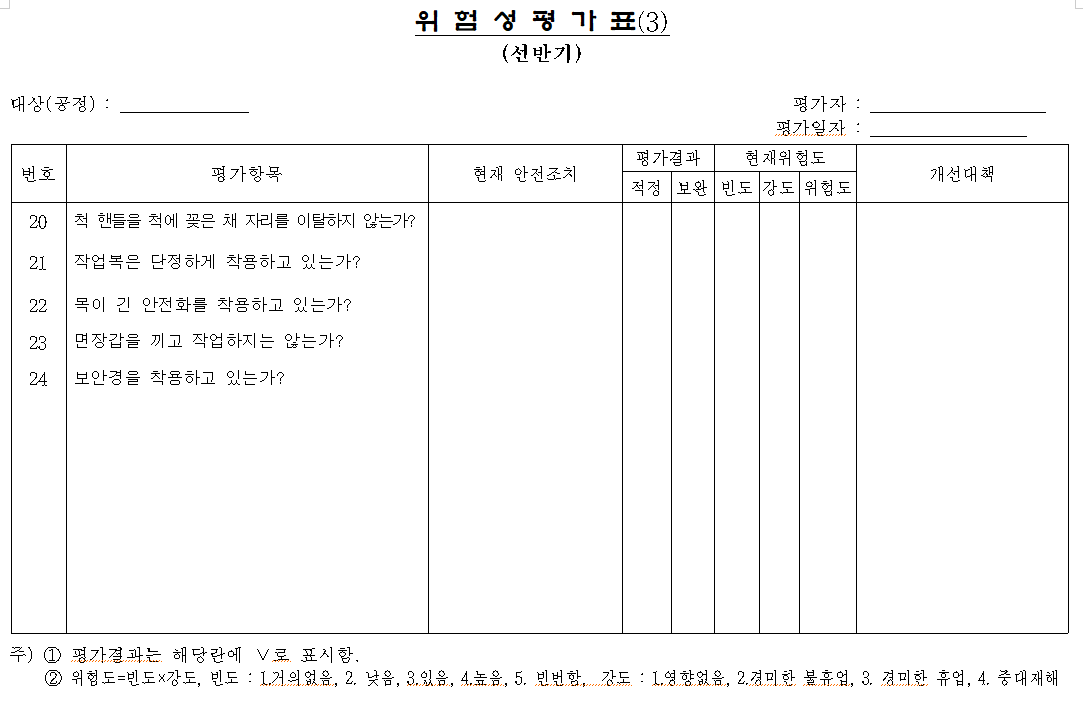 위험성평가표(선반) 작성자산업안전컨설팅|작성시간24.10.16|조회수21 목록 댓글 0 글자크기 작게가 글자크기 크게가 6.선반기 체크리스트.hwp36.00KB 첨부파일첨부된 파일이 2개 있습니다. png 파일 image.png 다운로드 hwp 파일 6.선반기 체크리스트.hwp 다운로드 다음검색 현재 게시글 추가 기능 열기 북마크 공유하기 신고 센터로 신고 댓글 댓글 0 댓글쓰기 답글쓰기 댓글 리스트