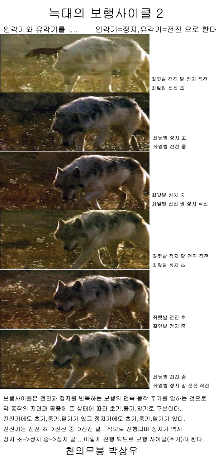 이렇게 이해 하여야 뒷다리의 힘의 발생과 그에 따른 무게 중심의 이동 그리고 정지까지 즉 '보행의 주기'를 아는 것이다.